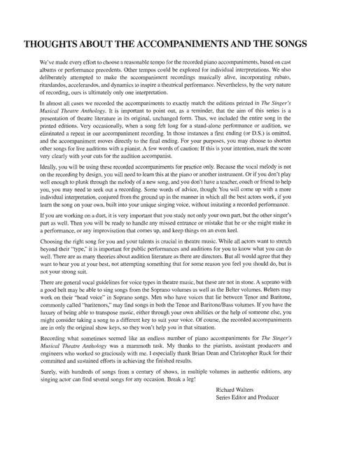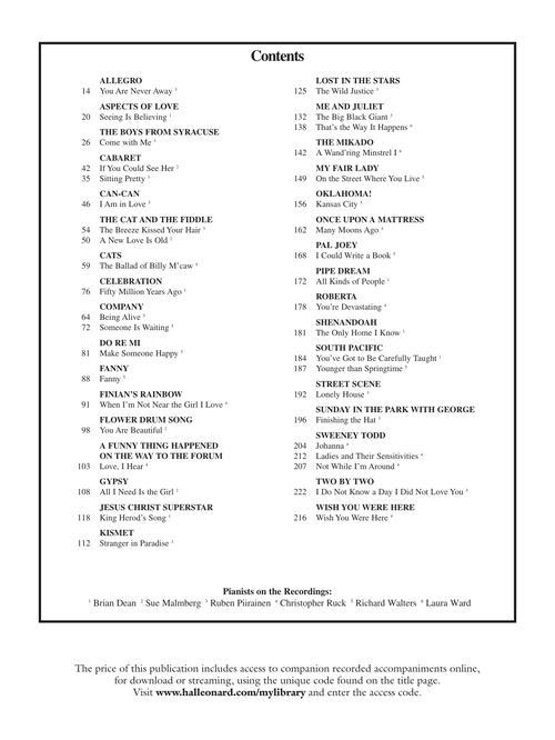The world's most trusted source for great theatre literature for singing actors. This edition includes access to online recordings of piano accompaniments for each piece. The book features authentic editions of each song in the original keys. The songs have been carefully chosen for each voice type and are culled from a wide selection of classic and contemporary shows. Contents: ALLEGRO: You Are Never Away