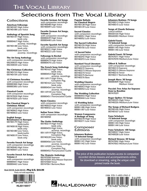 high voice, book/online audio, softcover audio online the largest, most comprehensive collection of french art songs ever published, with 60 songs by 24 composers. this wonderful anthology, with newly researched editions in clean new engravings, includes interesting notes about the composers, poets, facts about the composition and performance history for each song, and new line-by-line translations for study. contents: berlioz: villanelle · bizet: chanson d''avril · guitare · ouvre ton coeur · chabrier: les cigales · villanelle des petits canards · chausson: hebe · le charme · le colibri · le temps des lilas · debussy: beau soir · les cloches · mandoline · noel des enfants qui n''ont plus de maisons · dubarc: chanson triste · la vie anterieure · lamento · faure: apres un reve · automne · chanson d''amour · clair de lune · lydia · mandoline · notre amour · franck: nocturne · gounod: l''absent · o ma belle rebelle · venise · hahn: a chloris · offrande · si mes vers avaient des ailes · d''indy: madrigal · koechlin: si tu le veux · liszt: oh! quand je dors · martini: plaisir d''amour · massenet: nuit d''espagne · si tu veux, mignonne · mozart: dans un bois solitaire · paladilhe: psyche · poulenc: le bestiaire · ravel: sainte · cinq melodies populairs grecques · roussel: le bachelier de salamanque · sarabande · saint-saens: aimons-nous · l''attente · satie: je te veux · la statue de bronze · severac: les hiboux · philis · viardot: fleur dessecheehigh voice, book/online audio, softcover audio online the largest, most comprehensive collection of french art songs ever published, with 60 songs by 24 composers. this wonderful anthology, with newly researched editions in clean new engravings, includes interesting notes about the composers, poets, facts about the composition and performance history for each song, and new line-by-line translations for study. contents: berlioz: villanelle