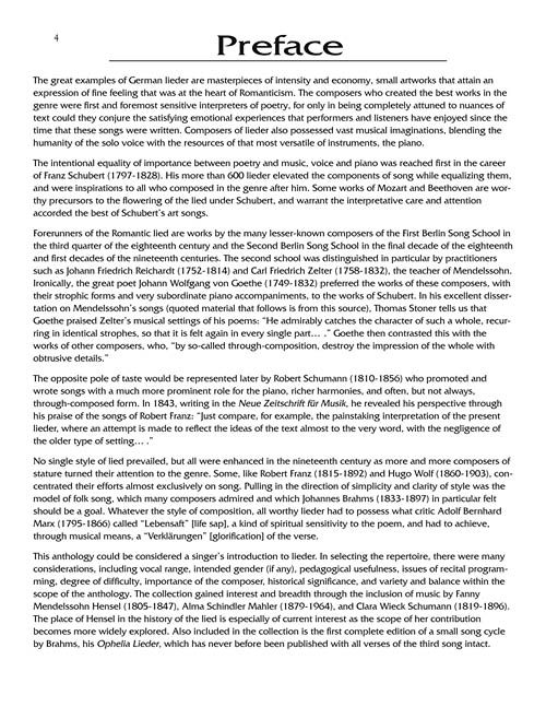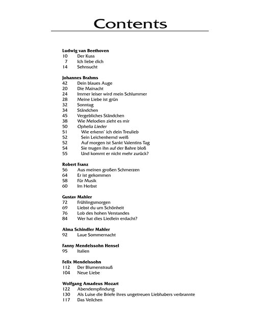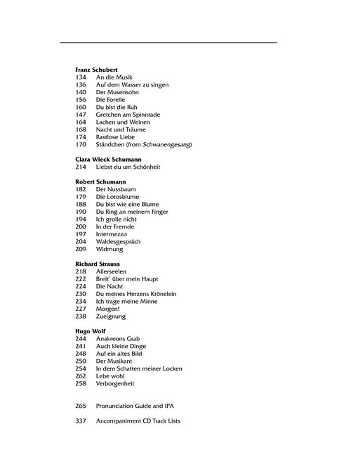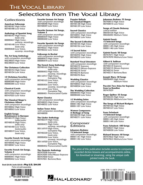 low voice, book with online audio, softcover audio online includes recorded diction lessons, ipa and word for word translations. the complete package is comparable to a retail price of $57.93 if components are bought separately. contents: beethoven: der kuss · ich liebe dich · sehnsucht · brahms: dein blaues auge · die mainacht · immer leiser wird mein schlummer · meine liebe ist grun · sonntag · standchen · vergebliches standchen · wie melodien zieht es mir · ophelia lieder · franz: aus meinen grossen schmerzen · er ist gekommen · fur musik · im herbst · mahler: fruhlingsmorgen · liebst du um schonheit · lob des hohen verstandes · wer hat dies liedlein erdacht? · alma mahler: laue sommernacht · fanny mendelssohn: italien · mendelssohn: der blumenstrauss · neue liebe · mozart: abendempfindung · als luise die briefe ihres ungetreuen liebhabers verbrannte · das veilchen · schubert: an die musik · auf dem wasser zu singen · der musensohn · die forelle · du bist die ruh · gretchen am spinnrade · lachen und weinen · nacht und traume · rastlose liebe · standchen · clara schumann: liebst du um schonheit · schumann: der nussbaum · die lotosblume · du bist wie eine blume · du ring an meinem finger · ich grolle nicht · in der fremde · intermezzo · waldesgesprach · widmung · richard strauss: allerseelen · breit'' uber mein haupt · die nacht · du meines herzens kronelein · ich trage meine minne · morgen! · zuelgnung · wolf: anakreons grab · auch kleine dinge · auf ein altes bild · der musikant · in dem schatten meiner locken · lebe wohl · verborgenheitlow voice, book with online audio, softcover audio online includes recorded diction lessons, ipa and word for word translations. the complete package is comparable to a retail price of $57.93 if components are bought separately. contents: beethoven: der kuss