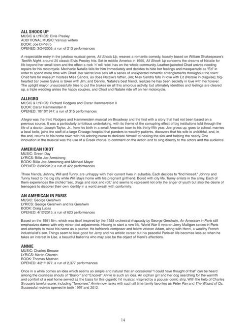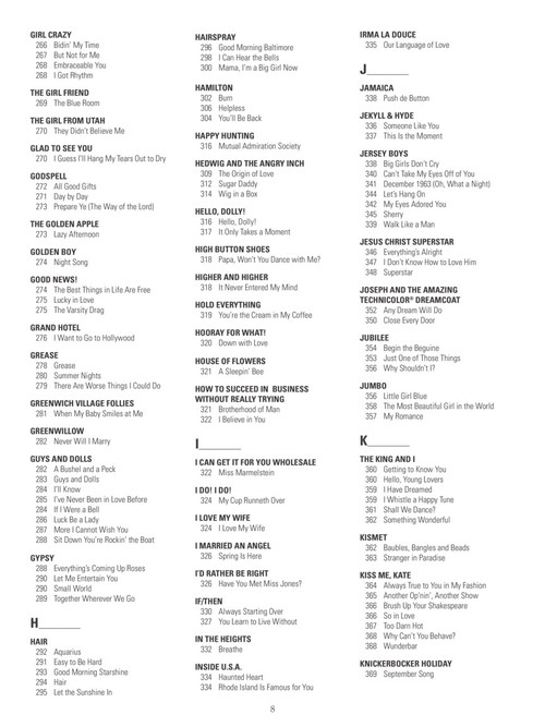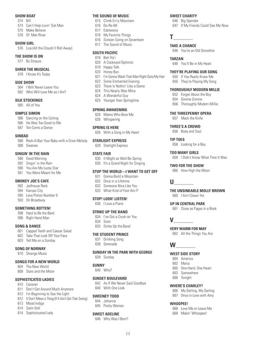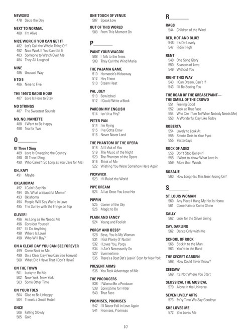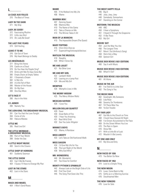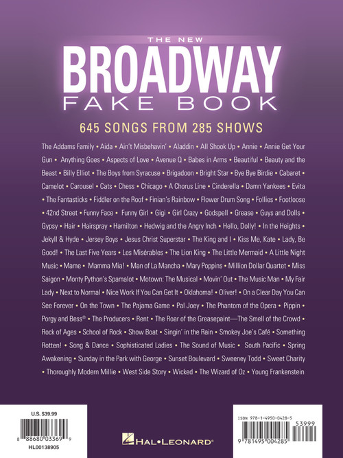 c instruments, softcover this amazing new collection features nearly 650 broadway songs arranged with melody, lyrics and chords for c instruments. definitely a must-own resource for any gigging or auditioning musician or actor! includes: all i ask of you · always look on the bright side of life · and i am telling you i''m not going · another op''nin'', another show · any dream will do · anything goes · aquarius · be our guest · bess, you is my woman · big spender · body and soul · brotherhood of man · brush up your shakespeare · but not for me · castle on a cloud · a change in me · close every door · consider yourself · dancing queen · defying gravity · do-re-mi · don''t cry for me argentina · don''t rain on my parade · edelweiss · everything''s coming up roses · footloose · for good · forty-second street · getting to know you · good morning baltimore · grease · hakuna matata · hello, dolly! · hey, look me over · how long has this been going on? · i dreamed a dream · i loved you once in silence · i wanna be a producer · i''m gonna sit right down and write myself a letter · if i were a rich man · the impossible dream (the quest) · in my life · love changes everything · mack the knife · mama, i''m a big girl now · mamma mia · memory · new york, new york · nice work if you can get it · nine to five · oklahoma · on broadway · on my own · one · people · the phantom of the opera · popular · send in the clowns · seventy six trombones · shall we dance? · she loves me · sit down you''re rockin'' the boat · springtime for hitler · strike up the band · suddenly seymour · the surrey with the fringe on top · thank heaven for little girls · tomorrow · try to remember · under the sea · unusual way · walk like a man · when i grow up · a whole new world · wishing you were somehow here again · you''ll never walk alone · younger than springtime · and more!c instruments, softcover this amazing new collection features nearly 650 broadway songs arranged with melody, lyrics and chords for c instruments. definitely a must-own resource for any gigging or auditioning musician or actor! includes: all i ask of you