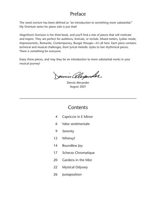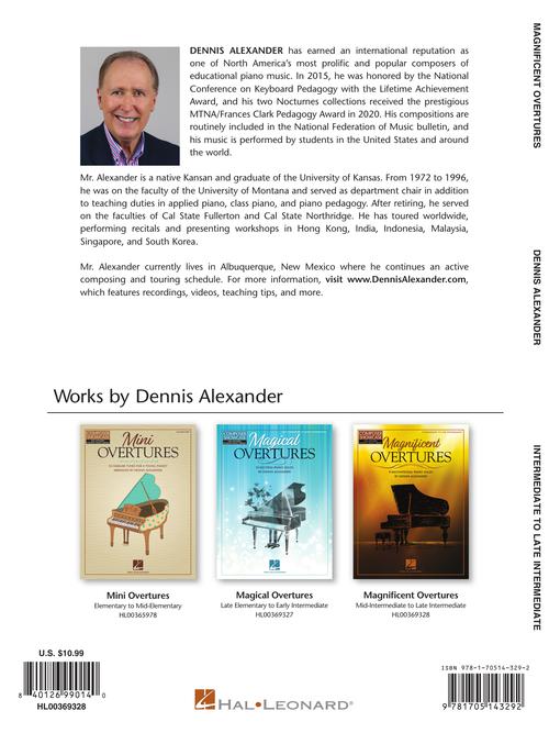 softcover overture has been defined as an introduction to something more substantial. dennis alexander''s overture series is just that! magnificent overtures is the final volume and features repertoire perfect for auditions, festivals, and recitals. featuring everything from mixed meters to a romantic waltz to impressionism, it''s all here! titles: boundless joy · capriccio in e minor · gardens in the mist · juxtaposition · mystical odyssey · scherzo chromatique · serenity · · whimsy! · valse sentimentale.softcover overture has been defined as an introduction to something more substantial. dennis alexander''s overture series is just that! magnificent overtures is the final volume and features repertoire perfect for auditions, festivals, and recitals. featuring everything from mixed meters to a romantic waltz to impressionism, it''s all here! titles: boundless joy
