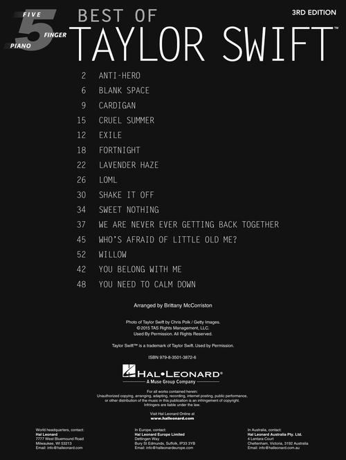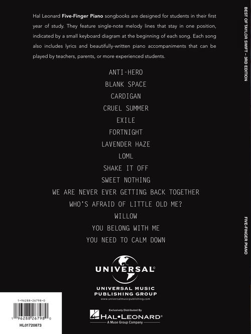 five-finger piano, softcover beginning piano playing swifties, rejoice! this latest edition of taylor swift for five-finger piano features 15 easy, playable arrangements in five finger piano notation of taylor swift''s hits, including songs from her latest release the tortured poets department. songs include: anti-hero · blank space · cardigan · cruel summer · fortnight · lavender haze · loml · shake it off · we are never ever getting back together · willow · you belong with me · and more! hal leonard''s five-finger piano songbooks are designed for students in their first year of study. they feature single-note melody lines that stay in one positon, indicated by a small keyboard diagram at the beginning of each song. each song also includes lyrics and beautifully-written piano accompaniments that can be played by teachers, parents, or more experienced students.five-finger piano, softcover beginning piano playing swifties, rejoice! this latest edition of taylor swift for five-finger piano features 15 easy, playable arrangements in five finger piano notation of taylor swift''s hits, including songs from her latest release the tortured poets department. songs include: anti-hero