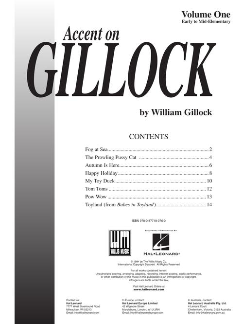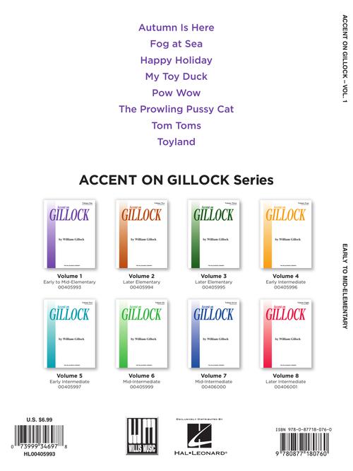 volume 1 book, softcover the accent on gillock series includes all of william gillock''s best-loved piano solos. volume 1 includes early to mid-elementary pieces, all written in the remarkable gillock style: · fog at sea · prowling pussy cat · autumn is here · happy holiday · my toy duck · tom toms · pow wow · toyland. to see other nfmc selections, click here.volume 1 book, softcover the accent on gillock series includes all of william gillock''s best-loved piano solos. volume 1 includes early to mid-elementary pieces, all written in the remarkable gillock style: